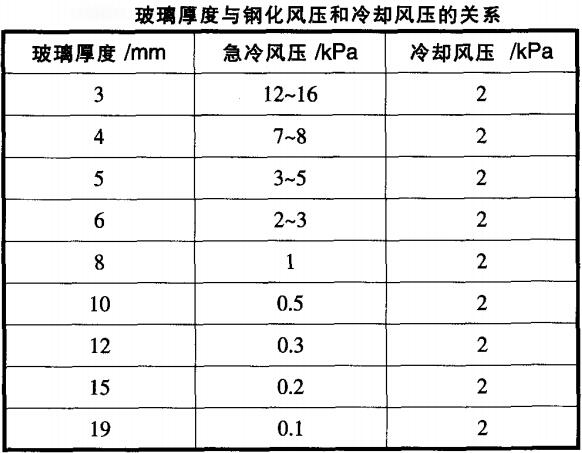 玻璃在風冷段的冷卻工藝分為兩個部分,分別是急冷段和冷卻段。鋼化時間是玻璃從加熱爐內進入風冷段后的急冷吹風時間,鋼化時間區(qū)別于玻璃的冷卻時間,鋼化時間對玻璃的鋼化程度起著重要的作用,急冷時間段是玻璃表面應力形成的過程,鋼化時間的設置主要依據玻璃的厚度 ,厚度越厚,玻璃的鋼化時間相應的越長。冷卻段的主要作用在于降低出爐后玻璃的表面溫度,玻璃出爐后的溫度必須降低到手可以進行接觸的溫度,不同厚度玻璃的鋼化時間與冷卻時間的設定可參考下表。